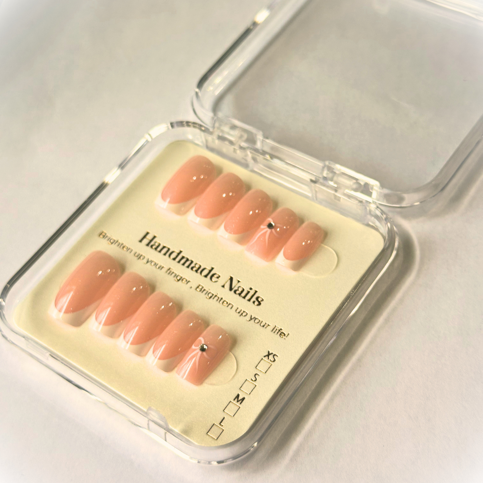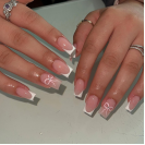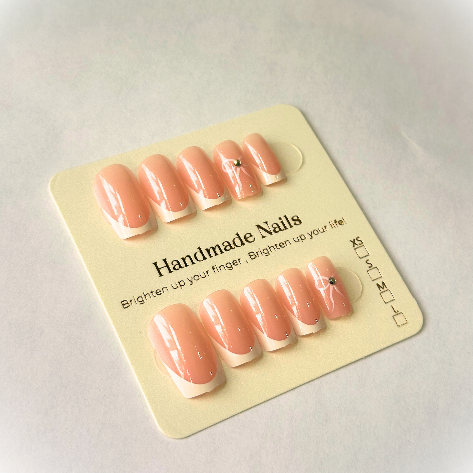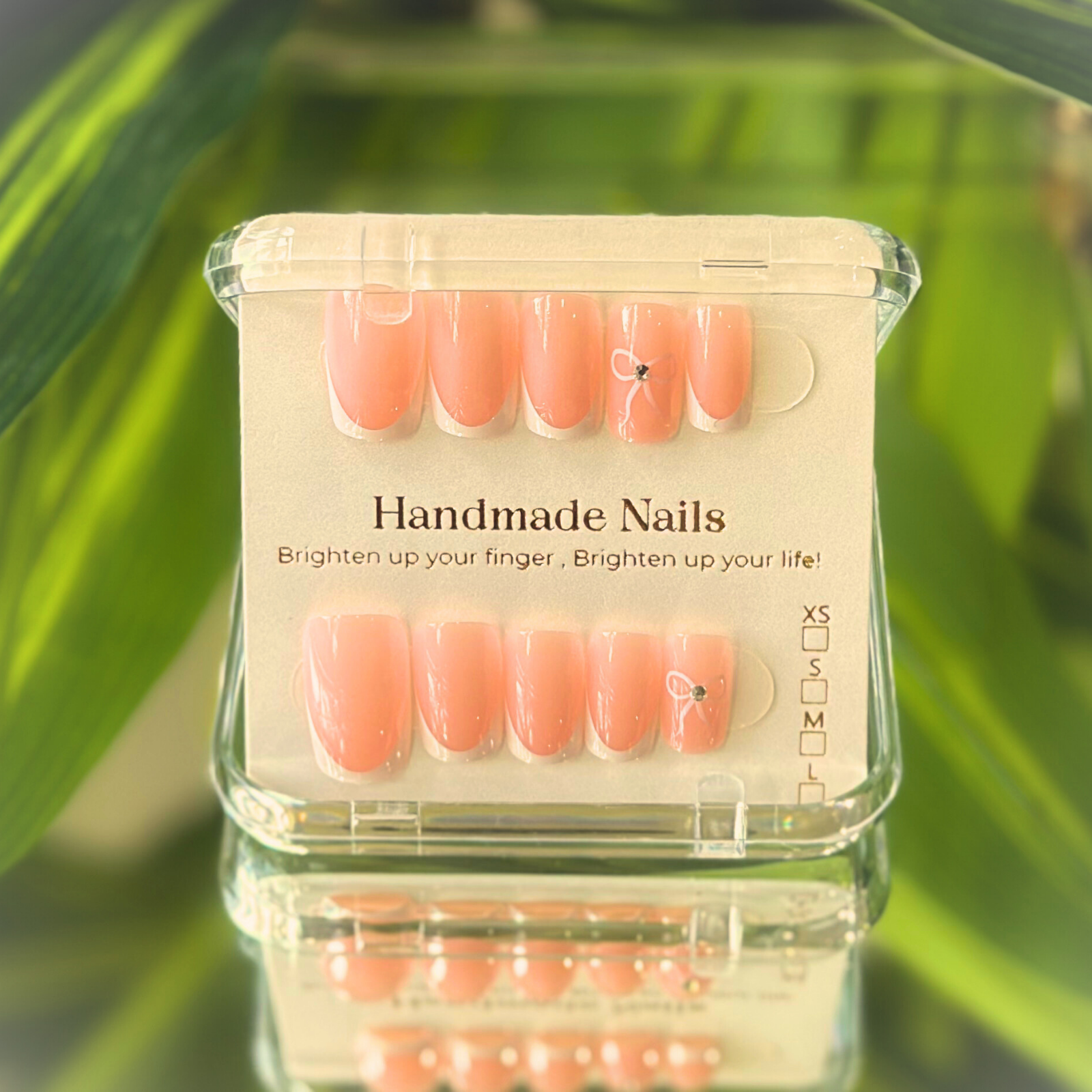 Fall in love with the timeless charm of French Affair, a delicate short-set designed for the effortlessly chic. Featuring clean, classic French tips paired with a playful pop of soft pink bows on the ring fingers, this set brings together sophistication and sweetness in perfect harmony.