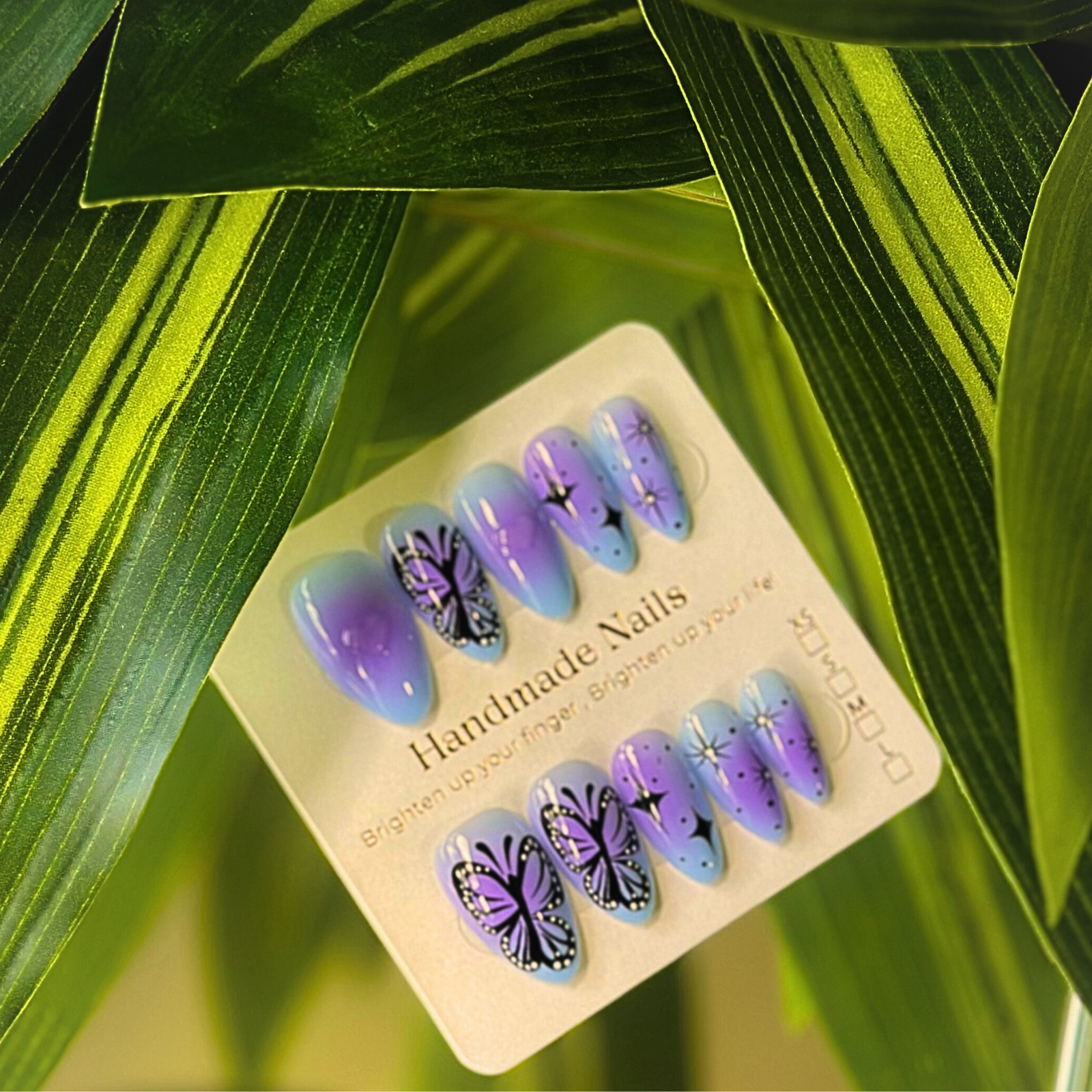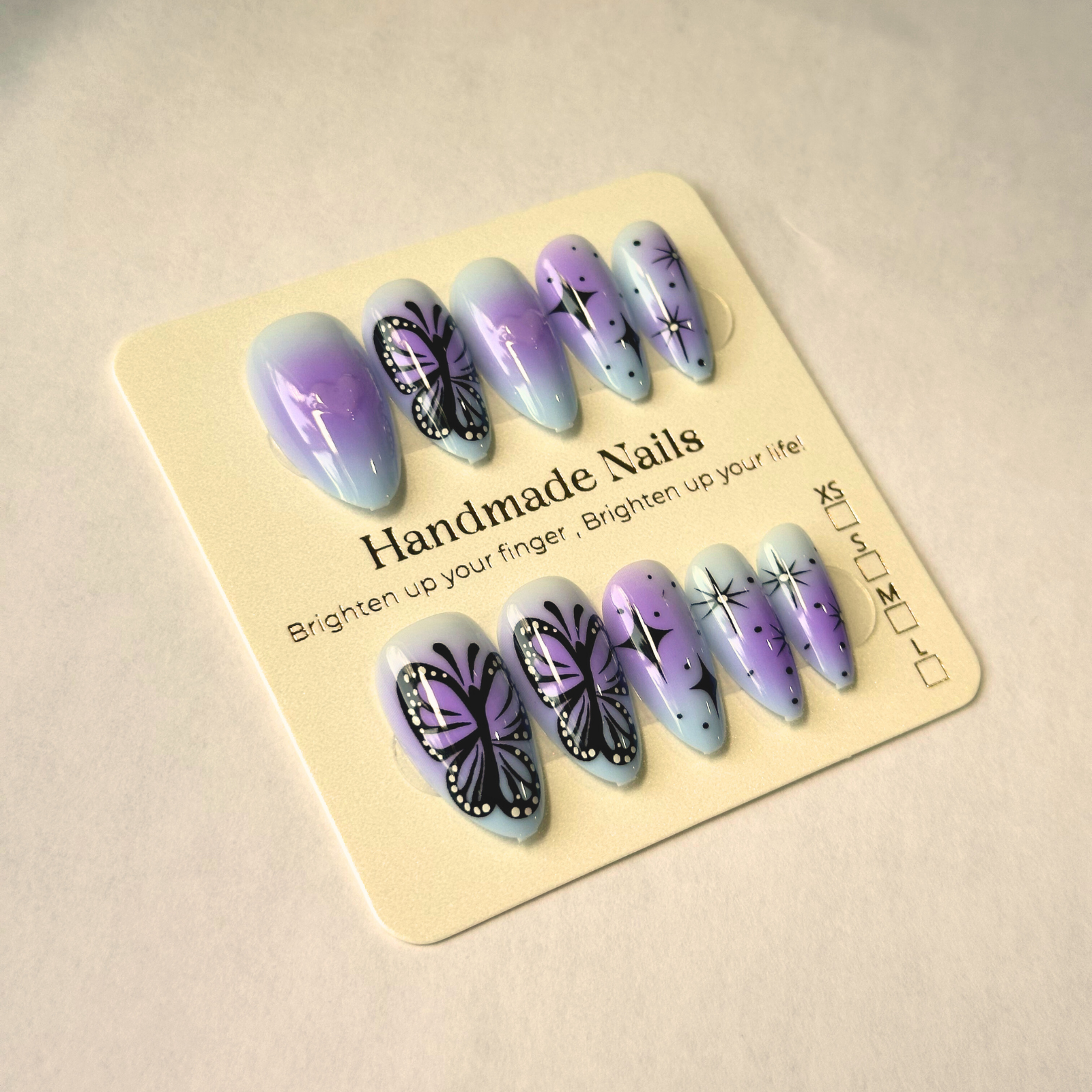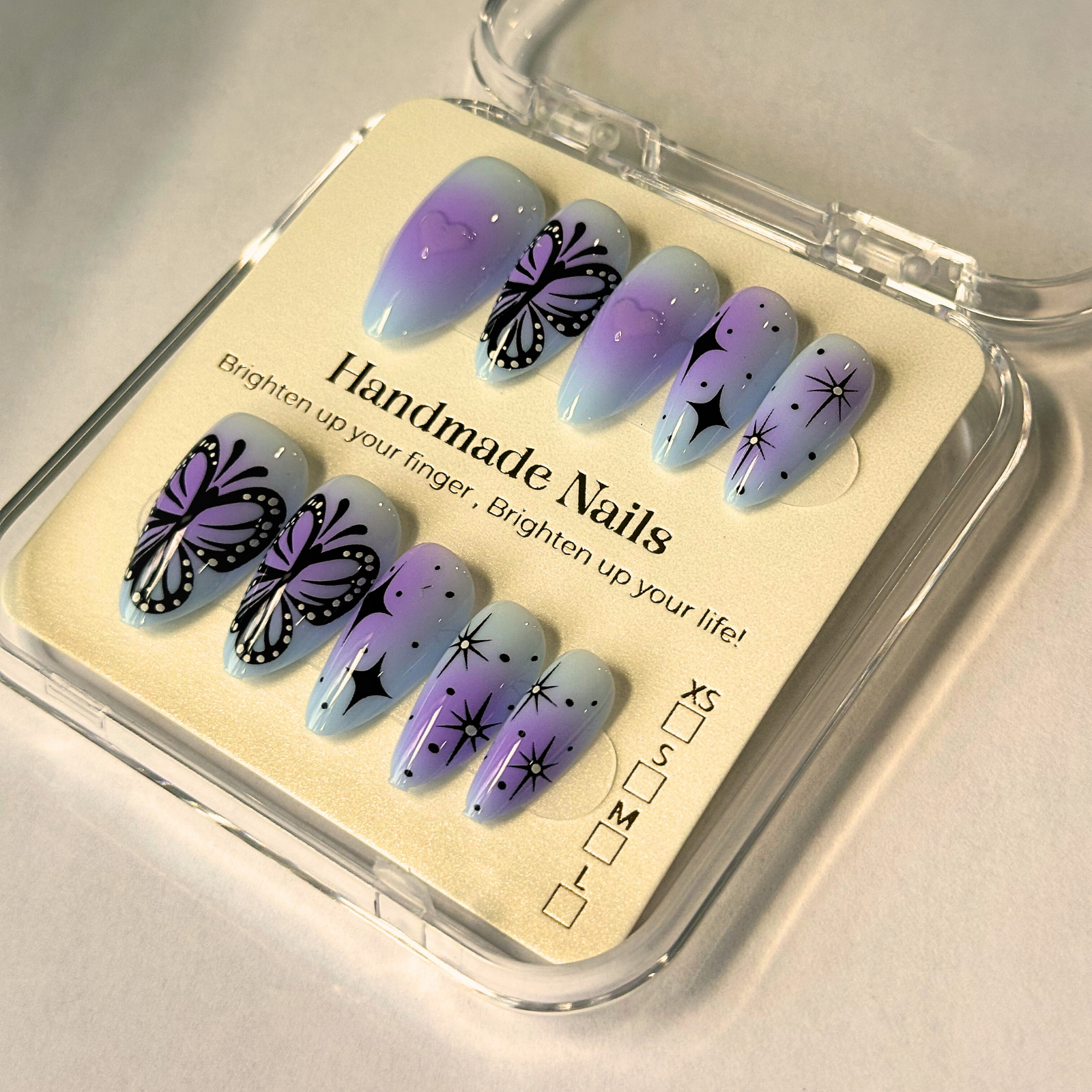 - Color: Purple ombre base with black butterfly wings + black colored star accents