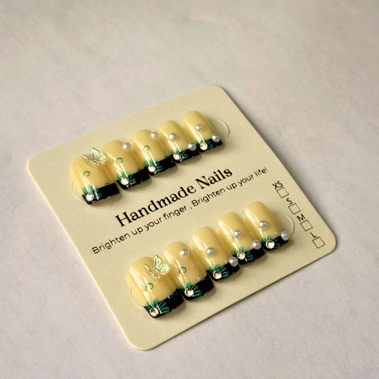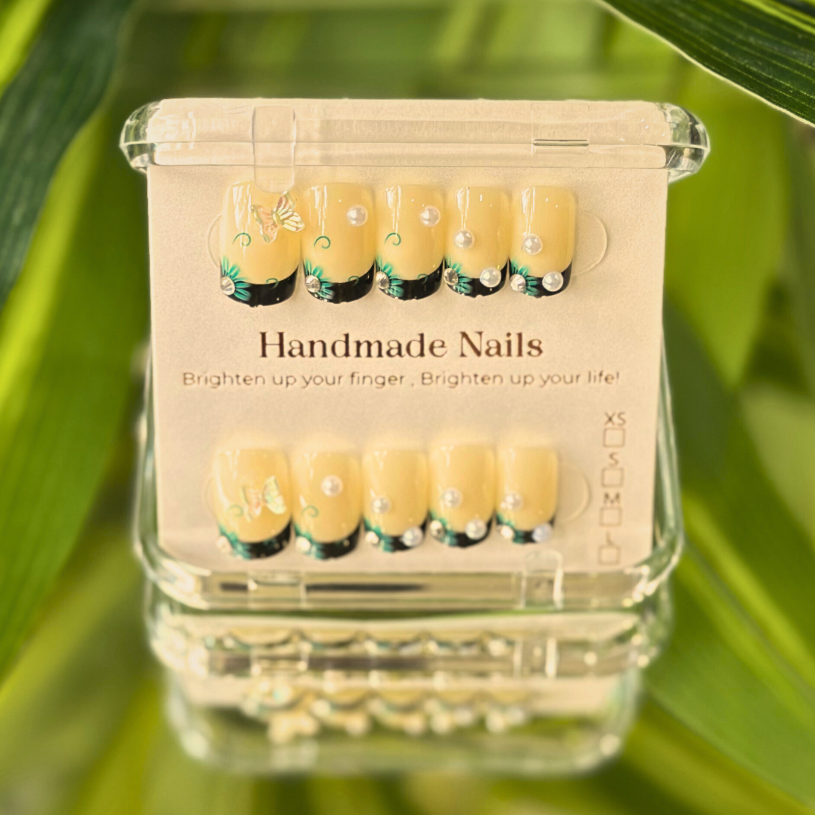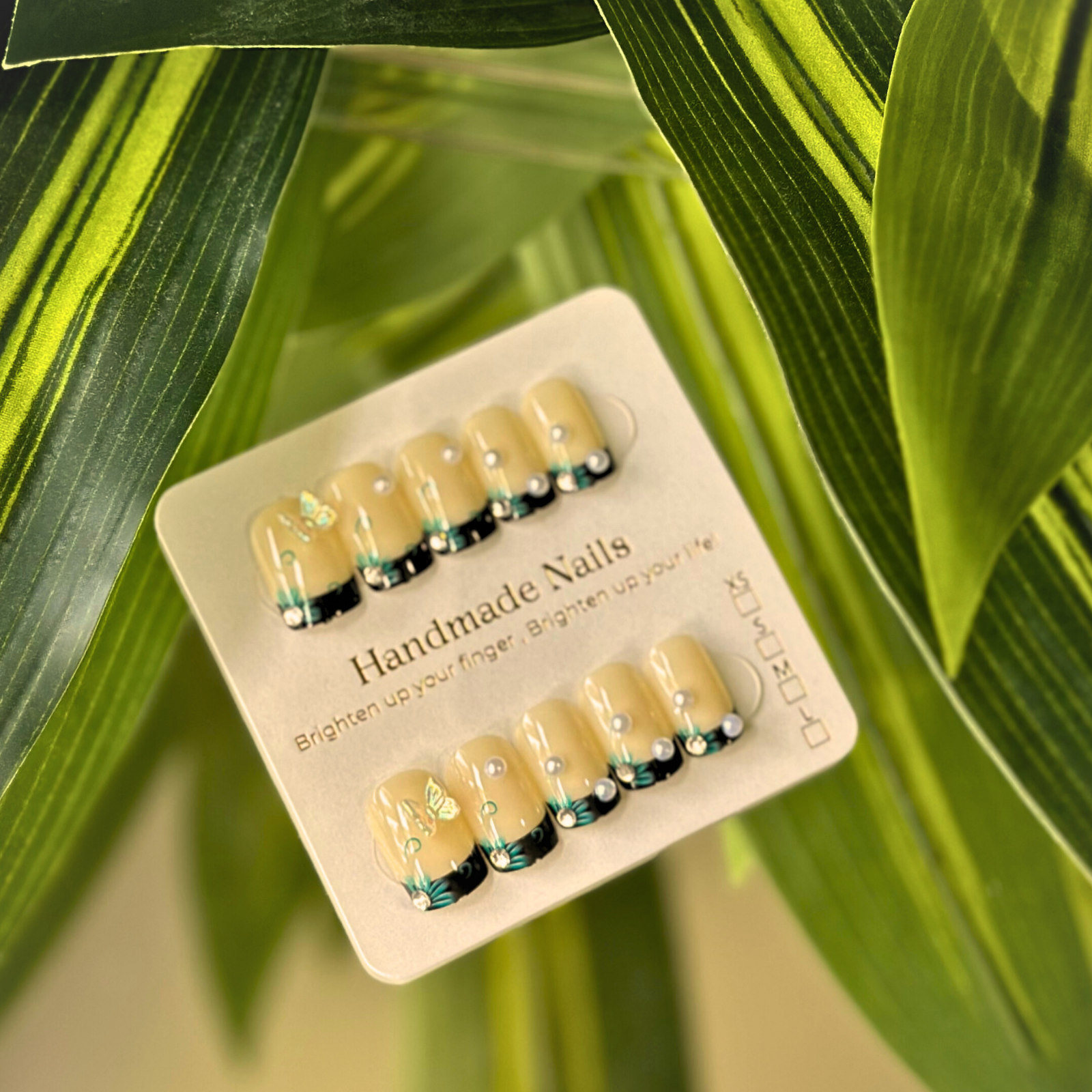 Grace meets modern elegance in this striking nail set featuring timeless black French tips. Each nail is delicately adorned with a single soft green flower accented by a luminous pearl at its center, creating a fresh, botanical contrast against the dark backdrop. Scattered pearls add an extra layer of sophistication, giving the entire set an ethereal, opalescent glow. This design captures the beauty of nature and the allure of refined glam in every detail.