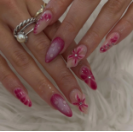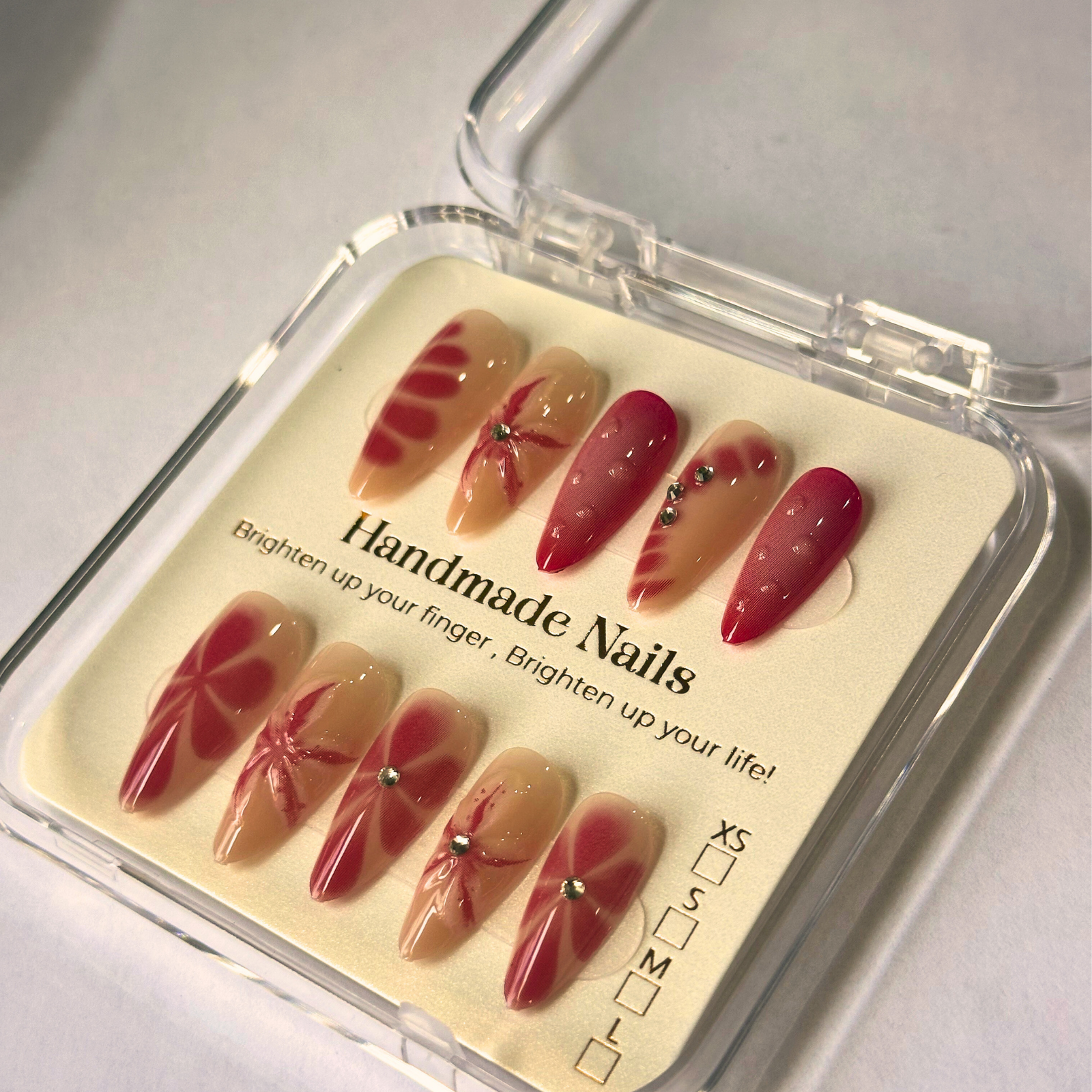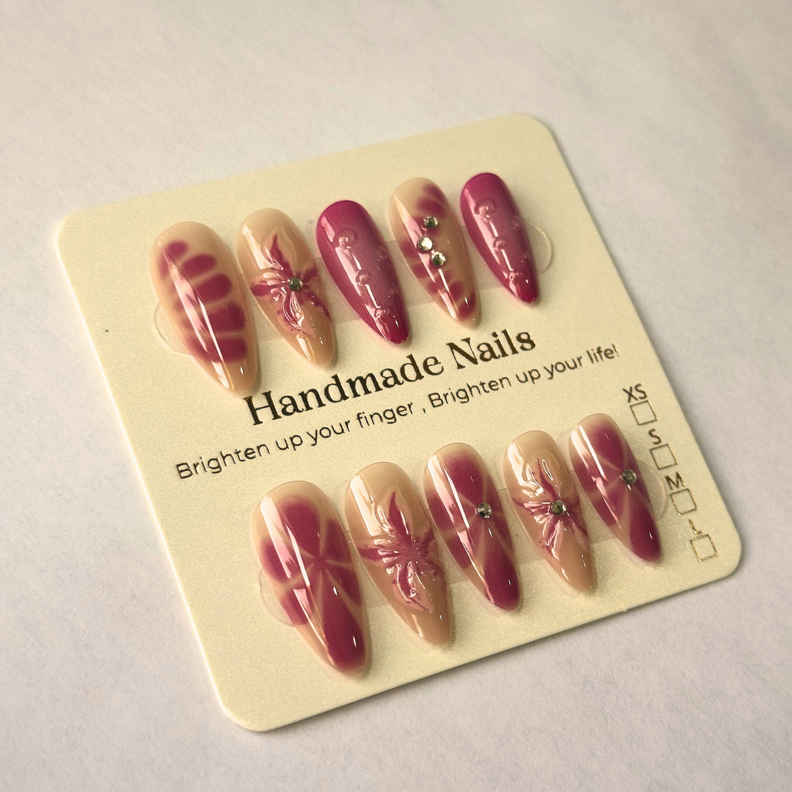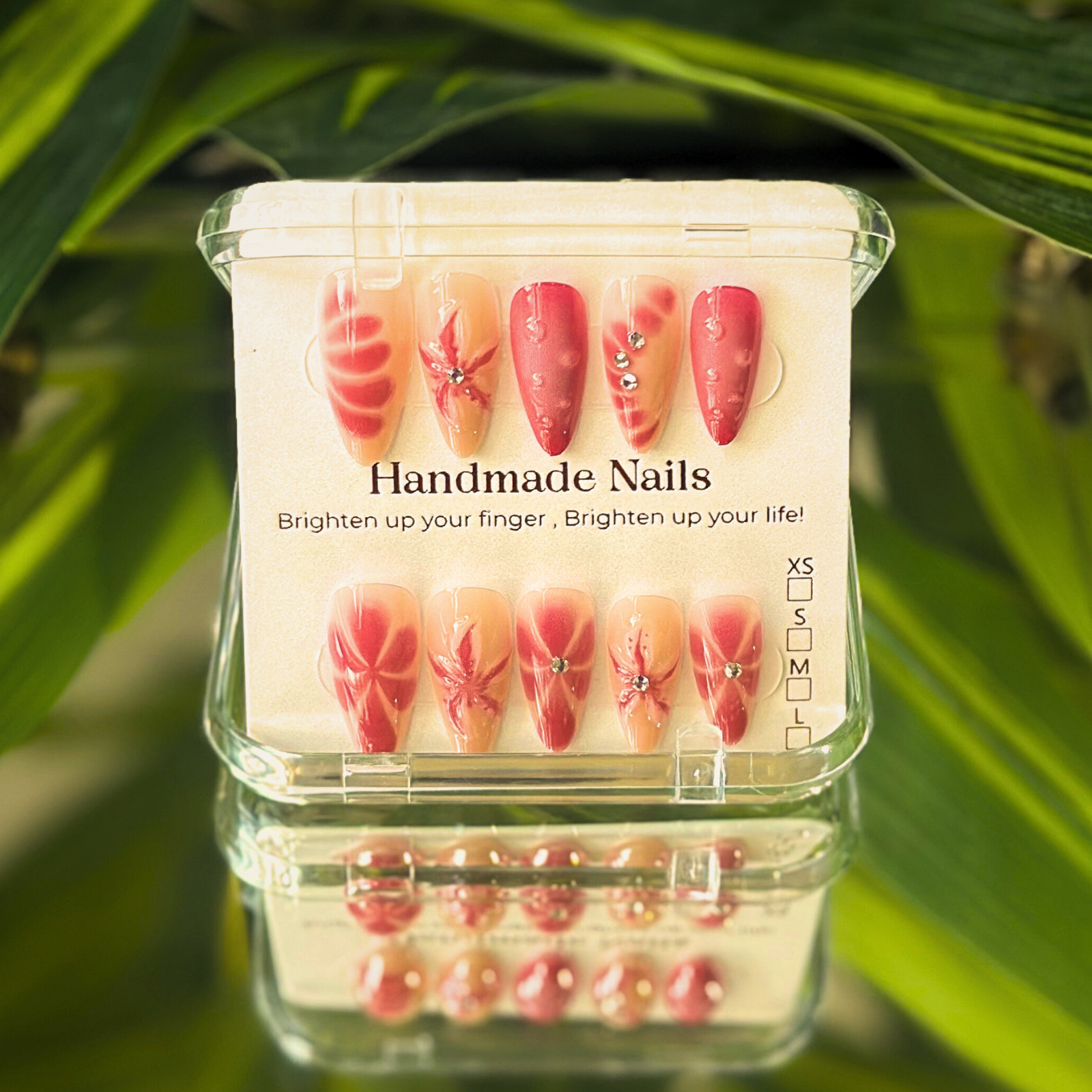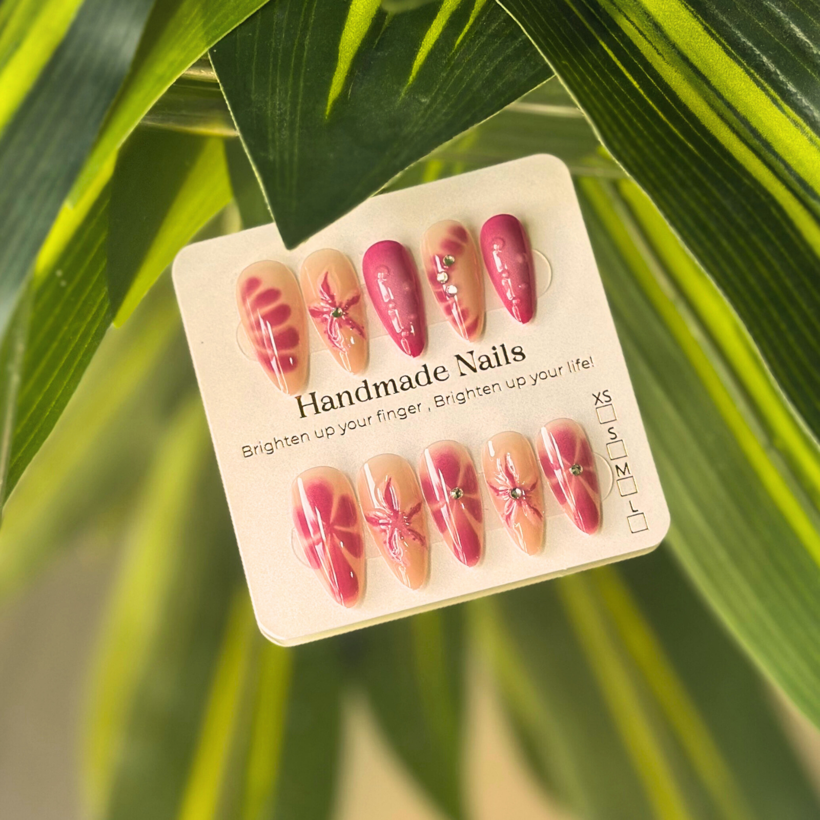Let your fingertips channel the magic of the shore with Sea Blush, a dreamy set inspired by ocean tides and warm sunset hues. Featuring a rich magenta-to-ruby pink ombre, delicate cream accents on the ring and middle finger, and a sculpted starfish design, this set blends beachy charm with bold, elegant energy. Unique pinky styles and shimmer details add an extra splash of personality to every hand.