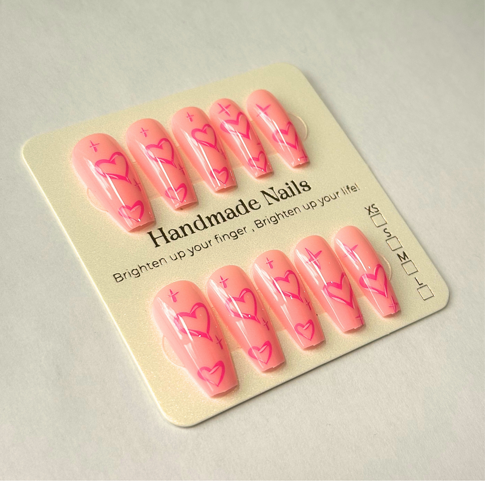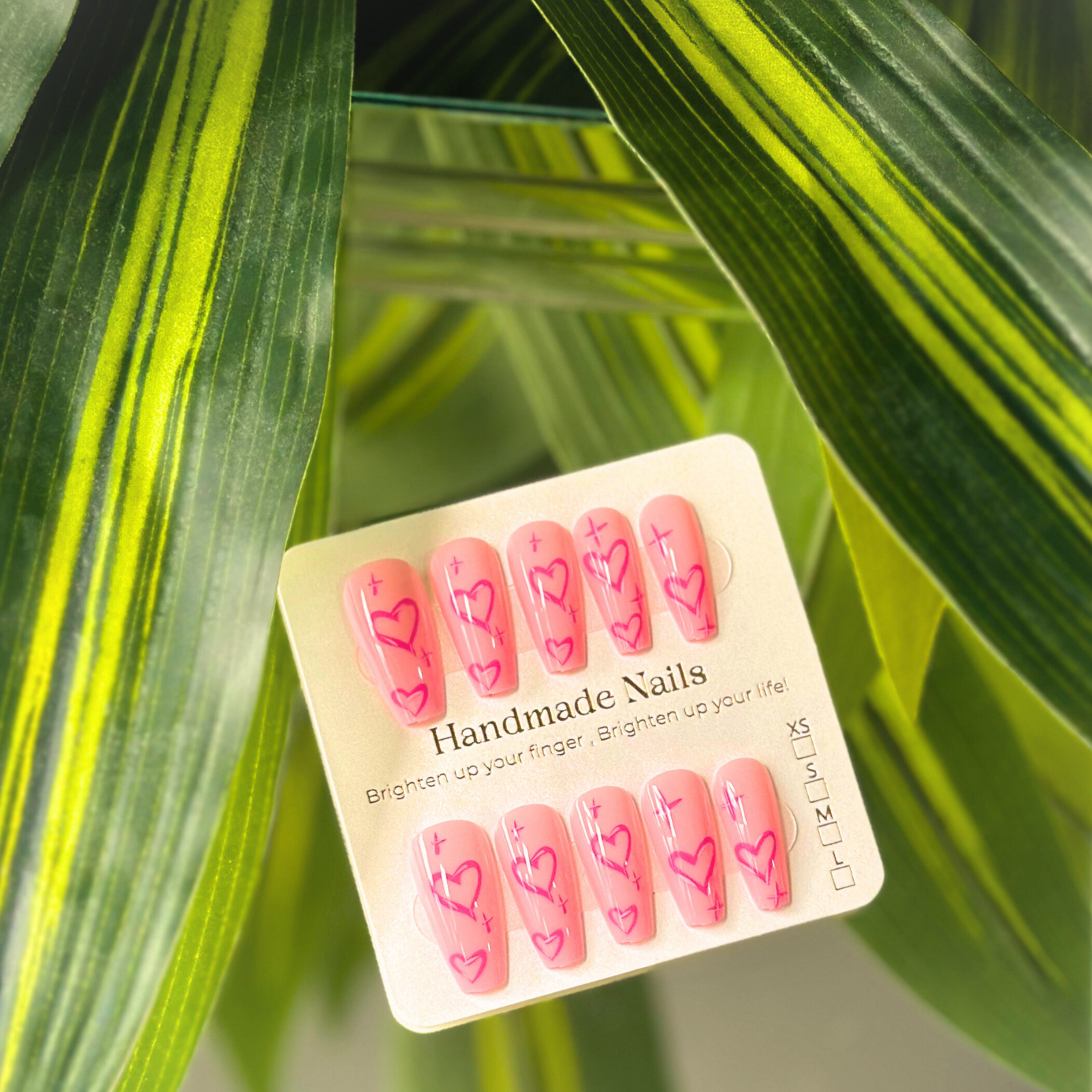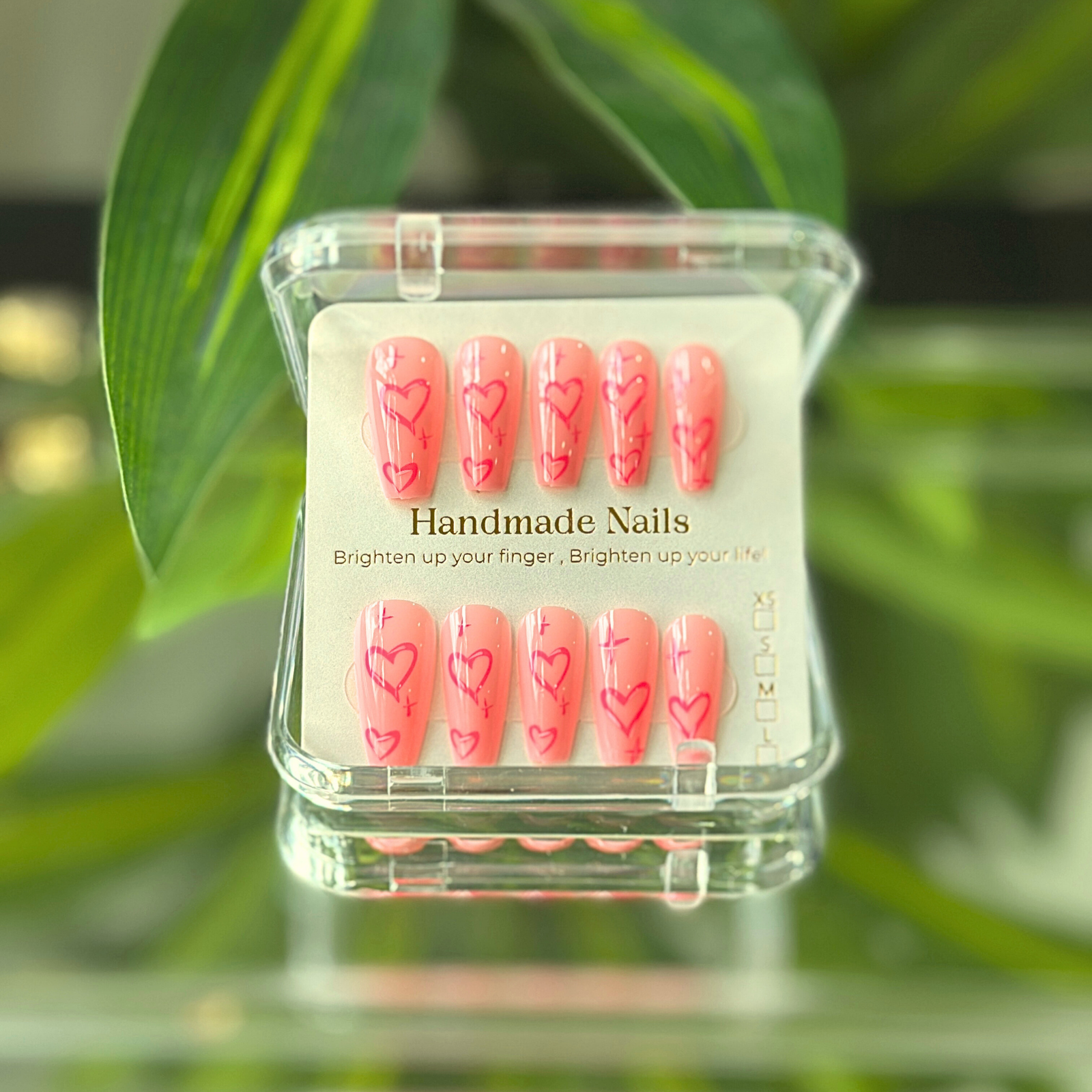 Fall head over heels with these stunning medium to long coffin-shaped press-on nails, designed to captivate with their delicate yet bold charm. The soft blush pink base is beautifully accented with striking hot pink hearts, creating a perfect balance of sweet and sassy.
