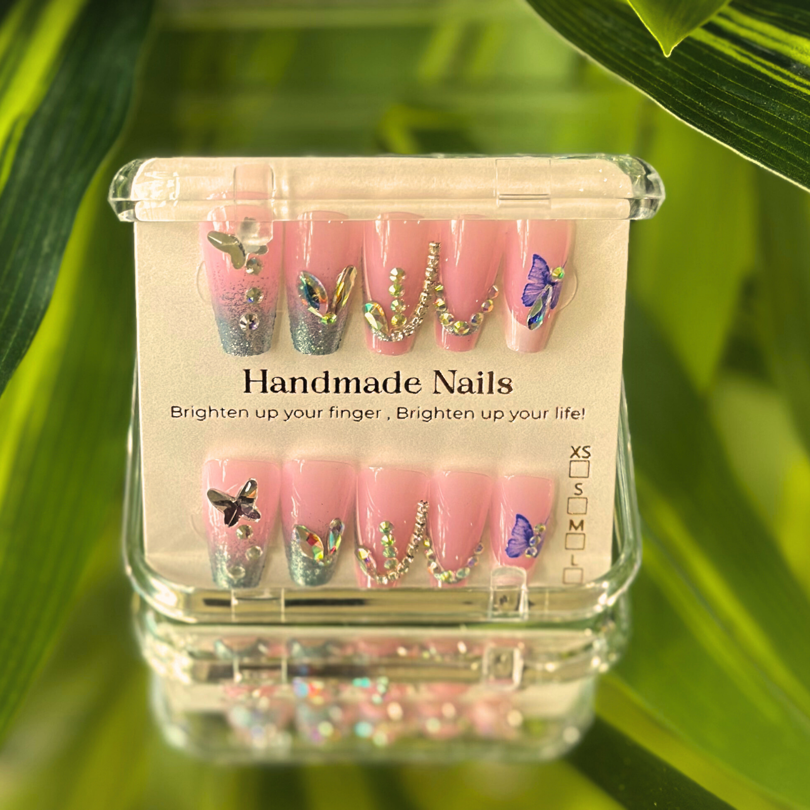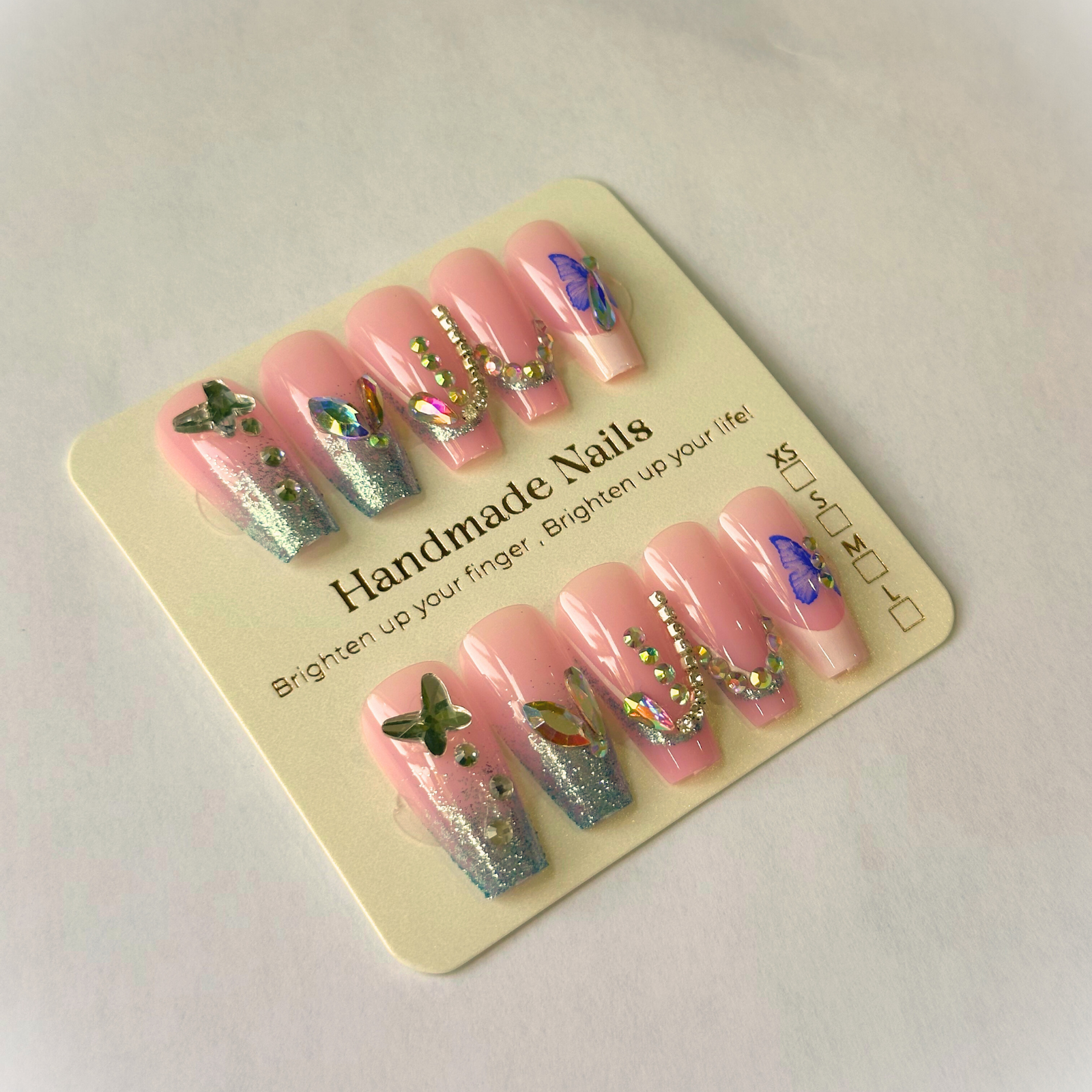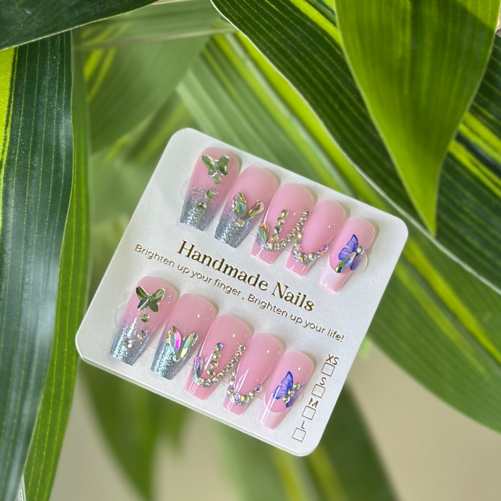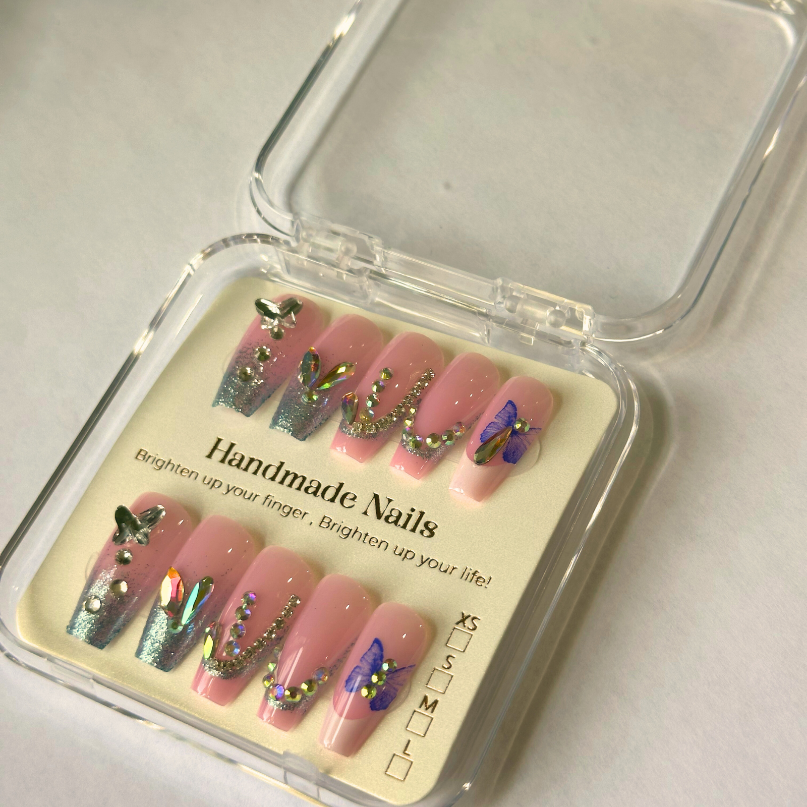 Step into a world of playful elegance with this enchanting nail set. Featuring shimmering silver pearls, delicate purple butterflies, and sparkling pink and blue gems, each nail tells a story of magic and whimsy. Perfect for those who love a little fantasy in their style.