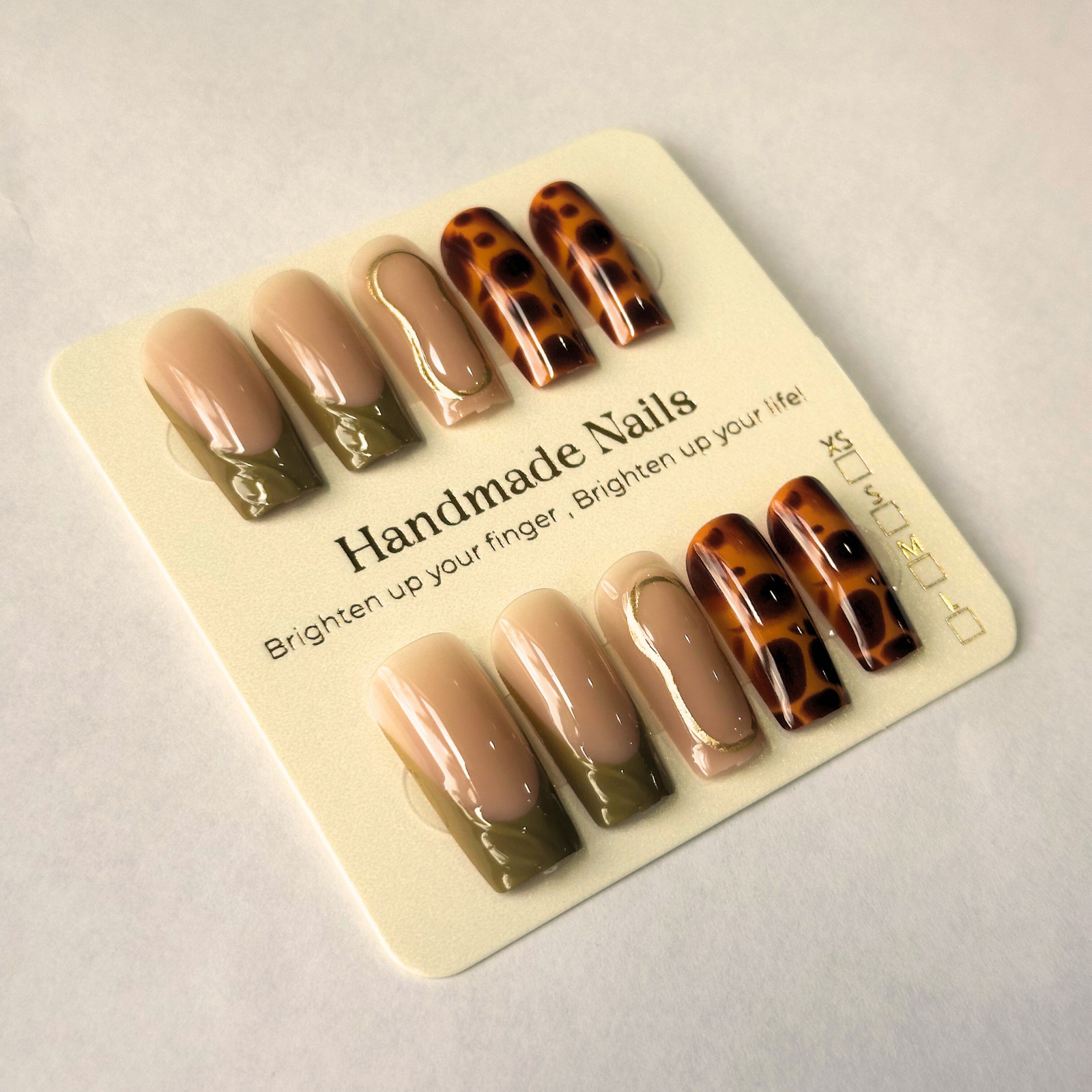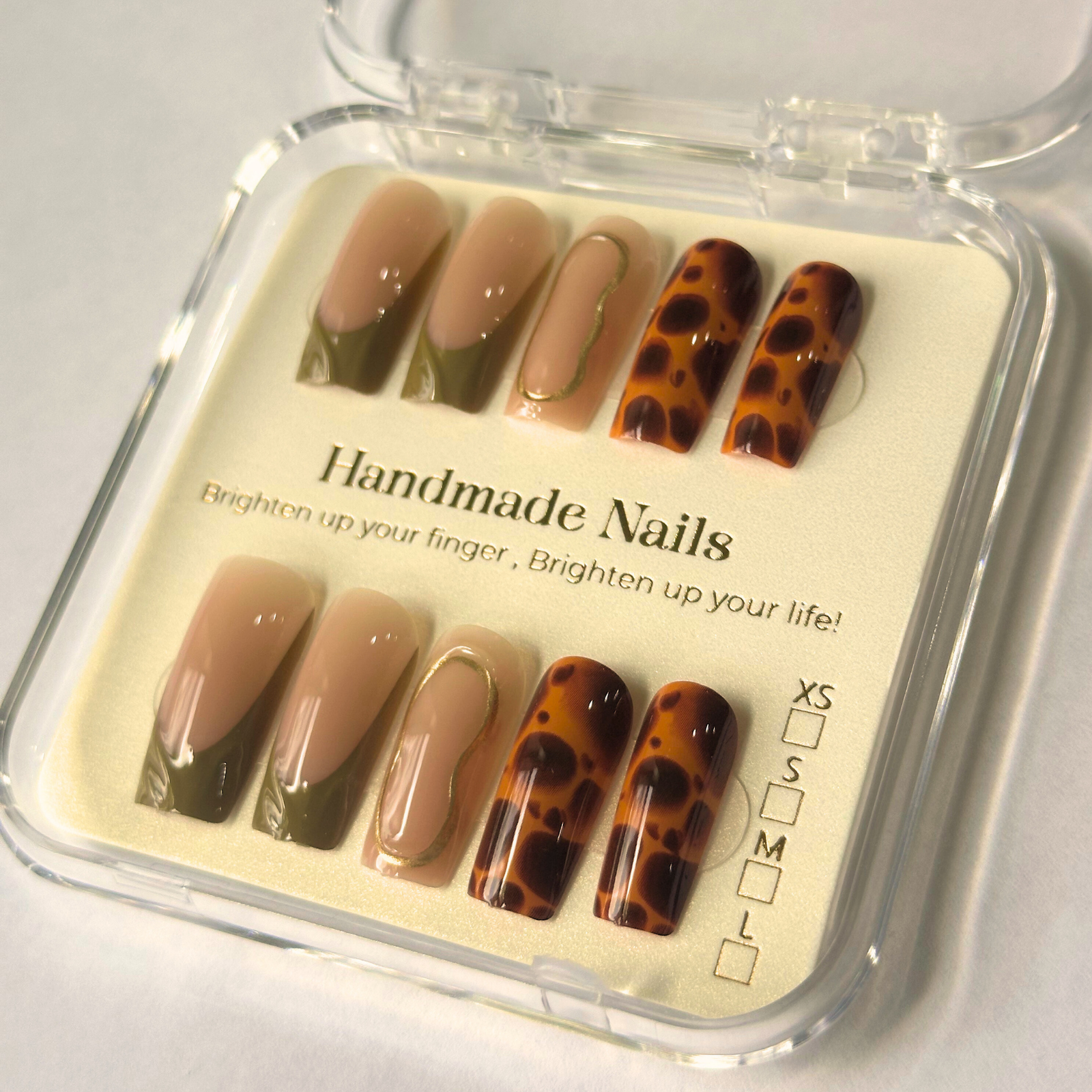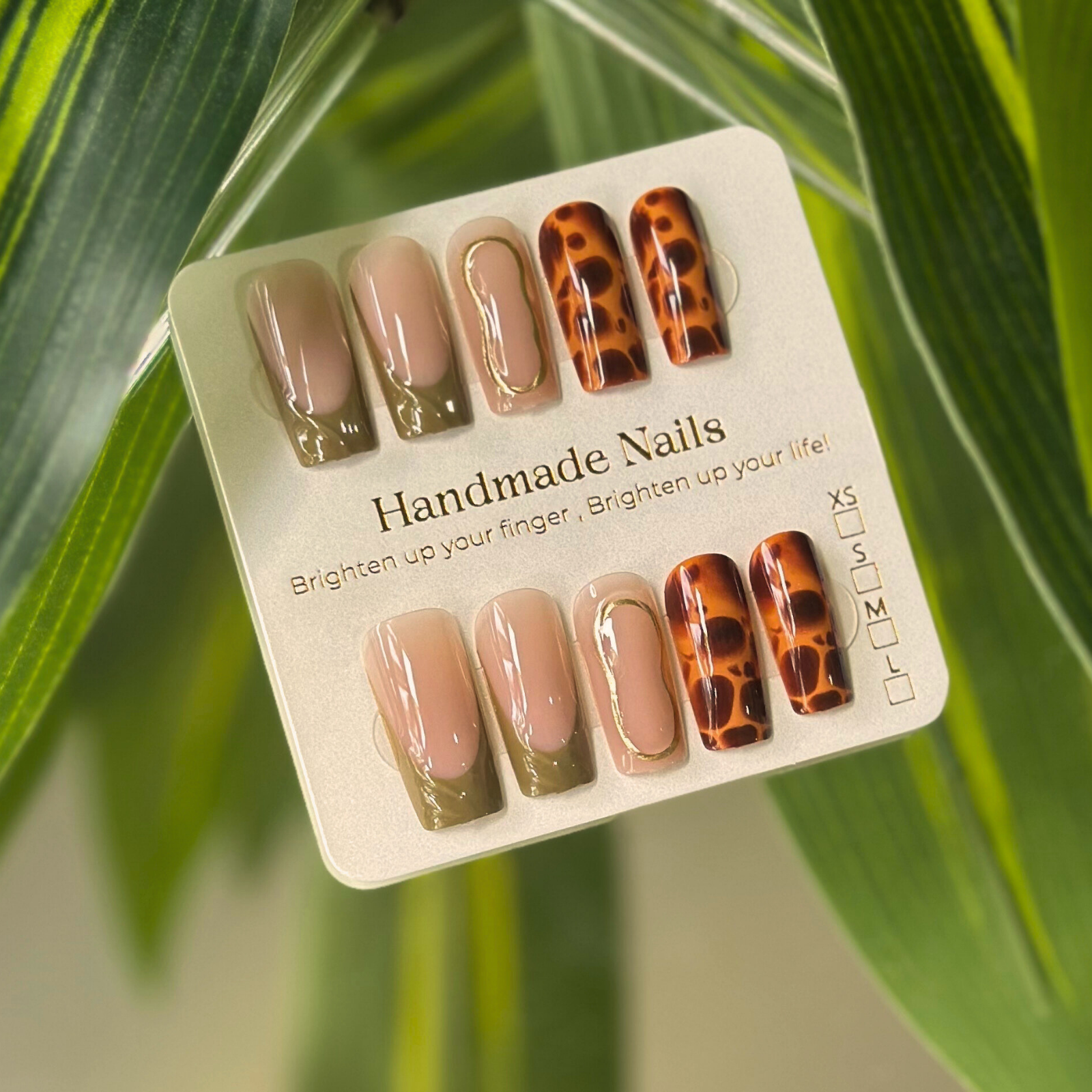 Step into your power with Wild Allure, a show-stopping square set that blends golden elegance with fierce edge. Featuring sleek gold French tips and a daring leopard print on the ring finger, this design is made for the confident babe who's never afraid to stand out.